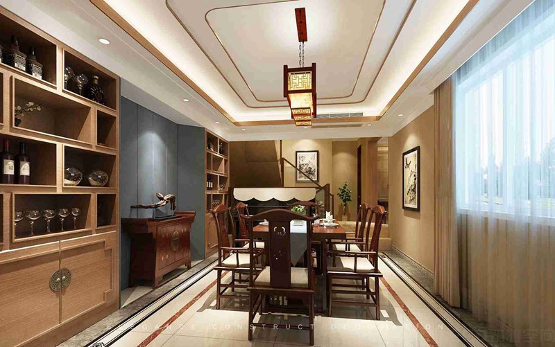 在整個(gè)設(shè)計(jì)中,室內(nèi)內(nèi)部裝飾多采用簡潔、硬朗的直線條,既迎合了中式家具追求內(nèi)斂、質(zhì)樸的設(shè)計(jì)風(fēng)格,又反映出現(xiàn)代人追求簡單生活的居住品味。中式元素的運(yùn)用,使整體空間感更加豐富,大而不空、厚而不重,有格調(diào)又不顯壓抑。