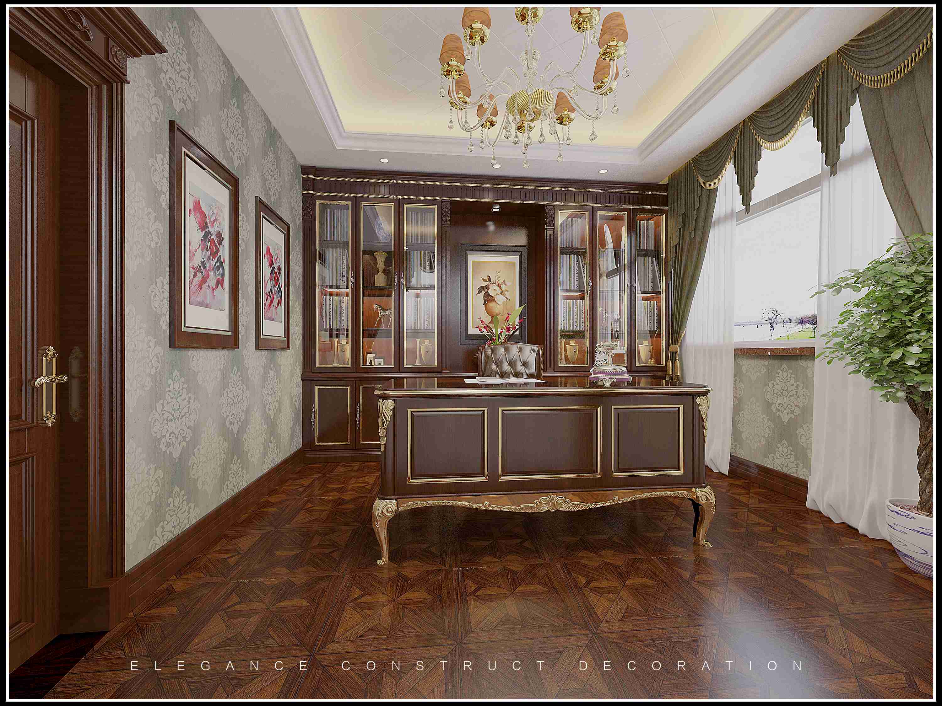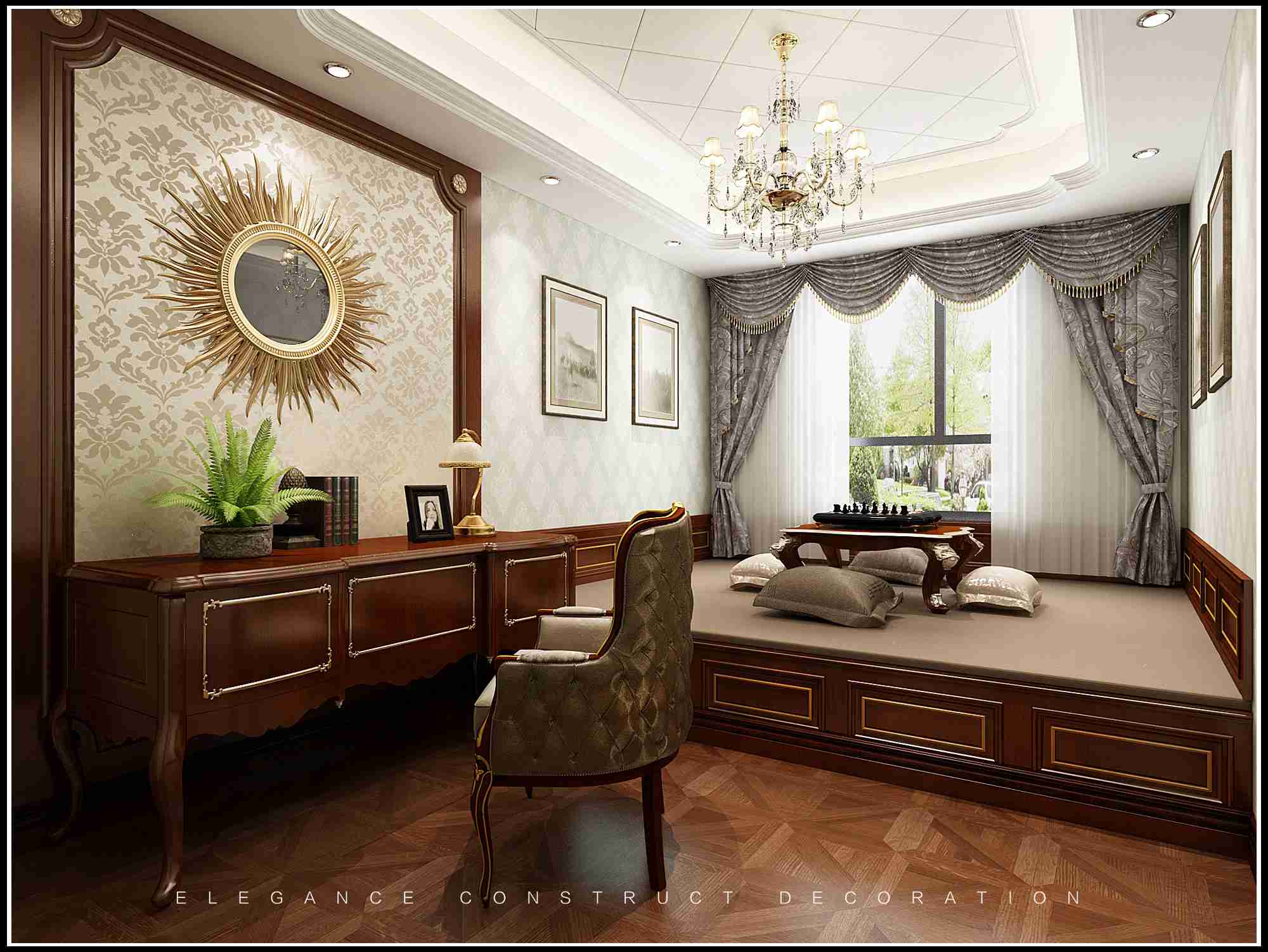 這里是傳統(tǒng)歐式書房,木質(zhì)家具的設(shè)計讓書房空間顯得十分莊重,同時書柜的設(shè)計,也體現(xiàn)出空間濃厚的文化氛圍,凸顯出空間主人濃厚的文化底蘊。