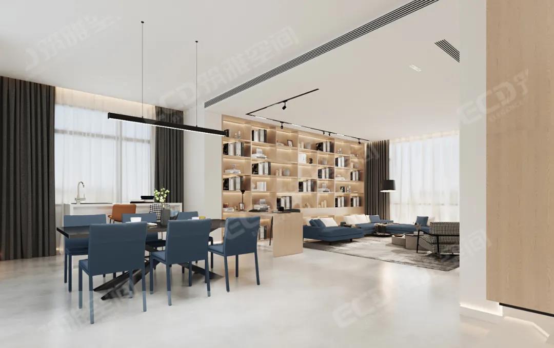 凸顯儀式感和尊貴感的超長雙橫廳空間,奢華的尺度是本案最為重要的空間亮點(diǎn)。捕捉到這個(gè)優(yōu)勢,設(shè)計(jì)師強(qiáng)調(diào)中式審美特點(diǎn)之一:對稱性。以過道為中軸,客廳、辦公區(qū)、餐廳、西式吧臺安然落座,確保整體視野廣闊,空間方寸毫不浪費(fèi)且功能極為融合。
