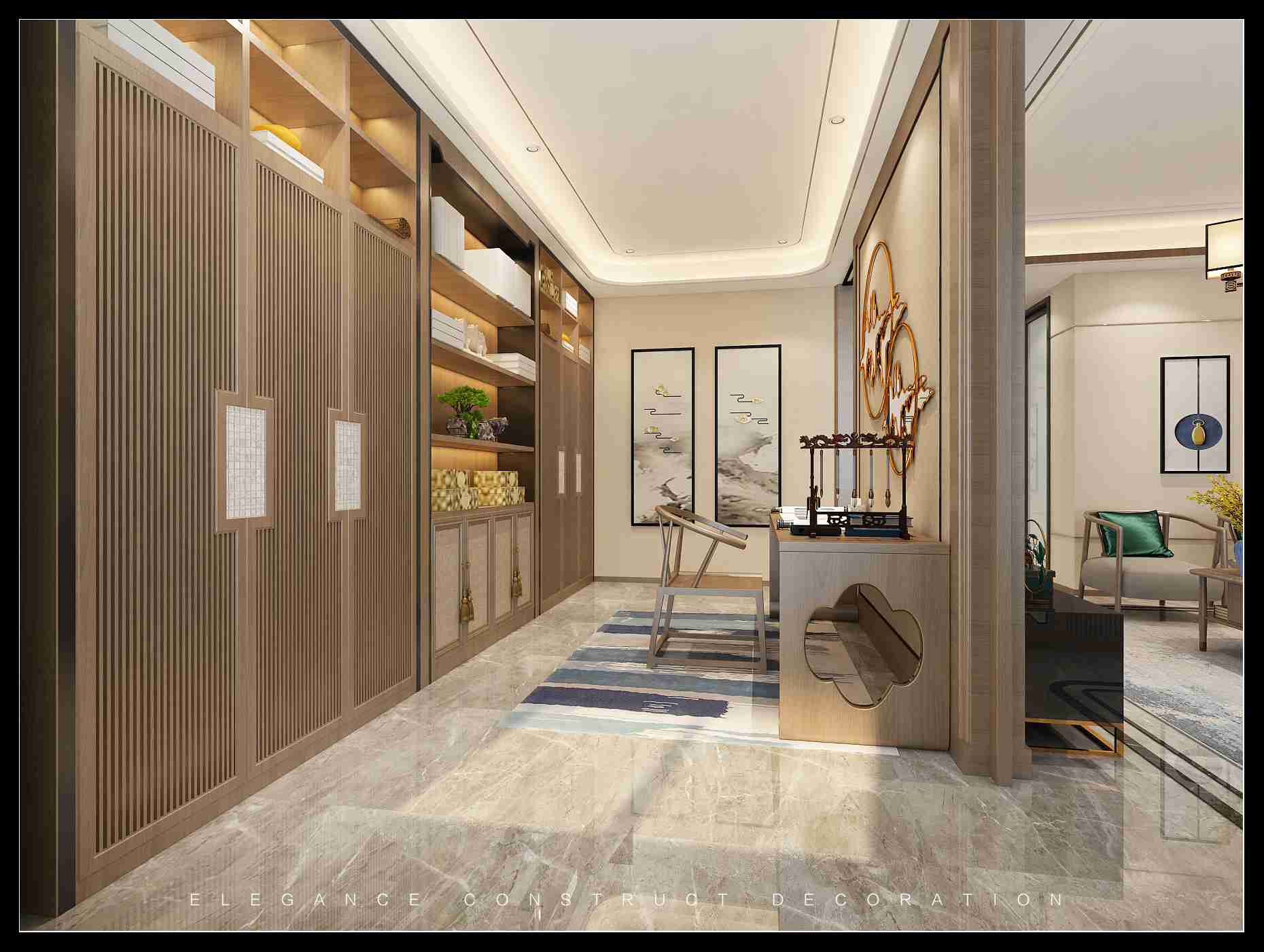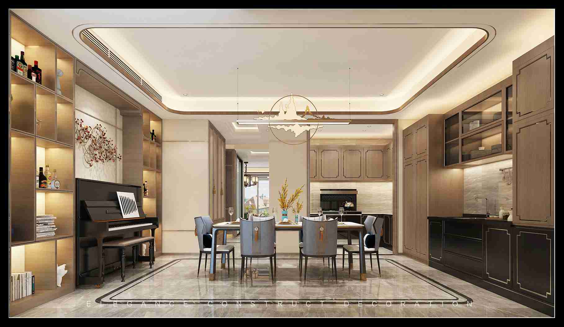 凸顯儀式感和尊貴感的超長雙橫廳空間,奢華的尺度是本案最為重要的空間亮點(diǎn)。捕捉到這個(gè)優(yōu)勢,設(shè)計(jì)師強(qiáng)調(diào)中式審美特點(diǎn)之一:對稱性。以過道為中軸,客廳、辦公區(qū)、餐廳、西式吧臺安然落座,確保整體視野廣闊,空間方寸毫不浪費(fèi)且功能極為融合。