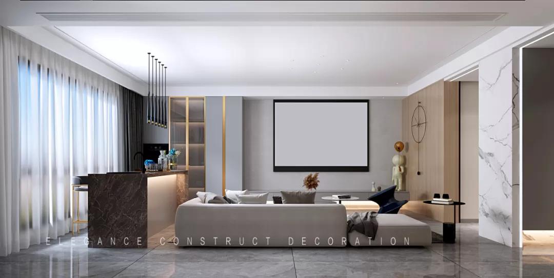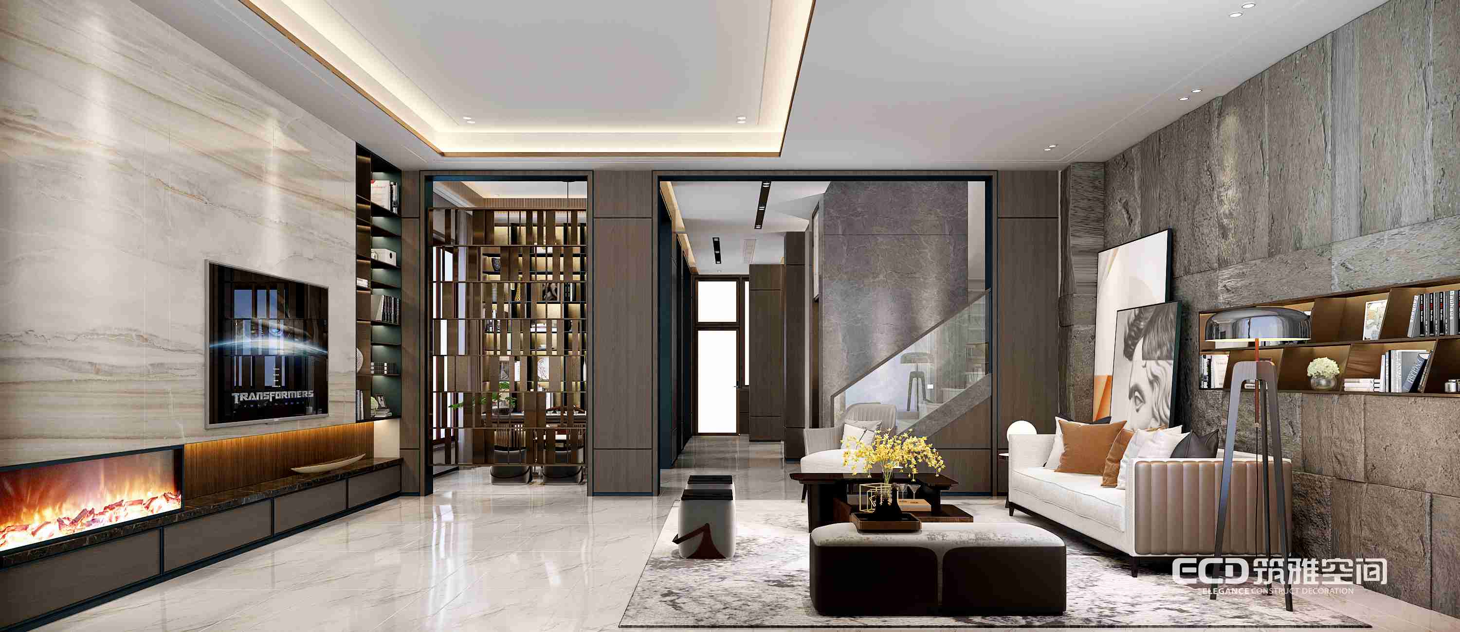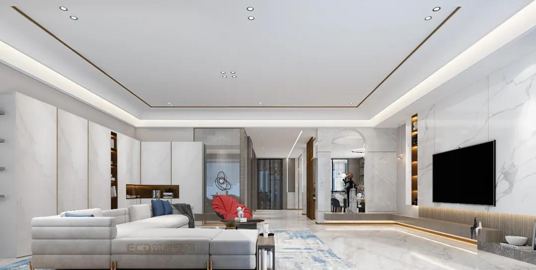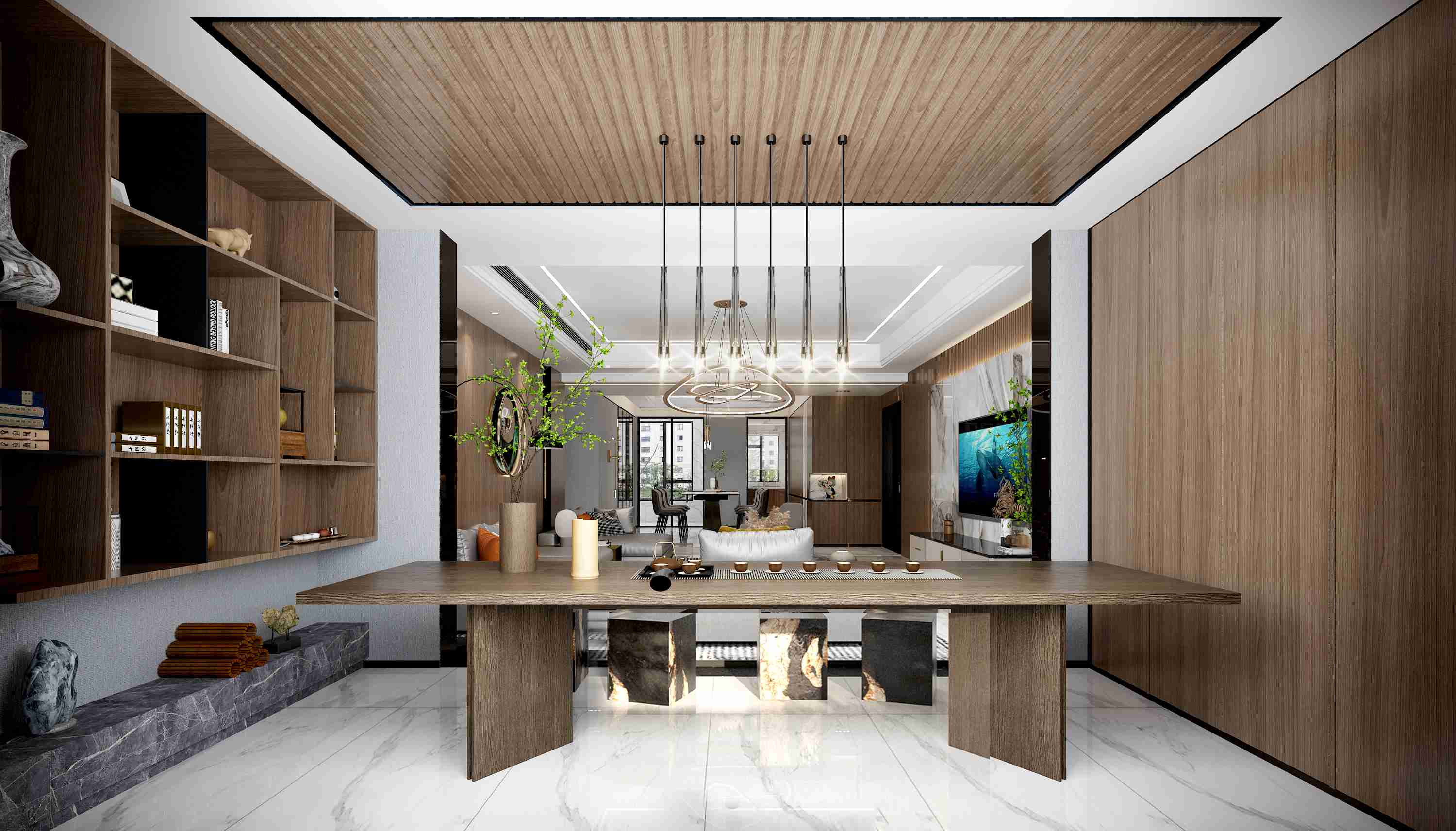 本案采用山水圖案,宋代美學、汝窯,以及原木色和如意紋等經(jīng)典中國元素,通過一些半透屏風隔斷的巧妙運用,將玻璃、石材和金屬材質(zhì)相組合,并將藝術貫穿其中,在原木色系的映襯下,極力展現(xiàn)中國古代居住空間的人文情懷。半透玻璃隔斷,像一層輕紗懸掛,透過這邊看向遠方,一步一景,似穿梭于山林蒼云間,又相互溝通,又彼此隔離,將整個空間互相滲透、回旋流動。