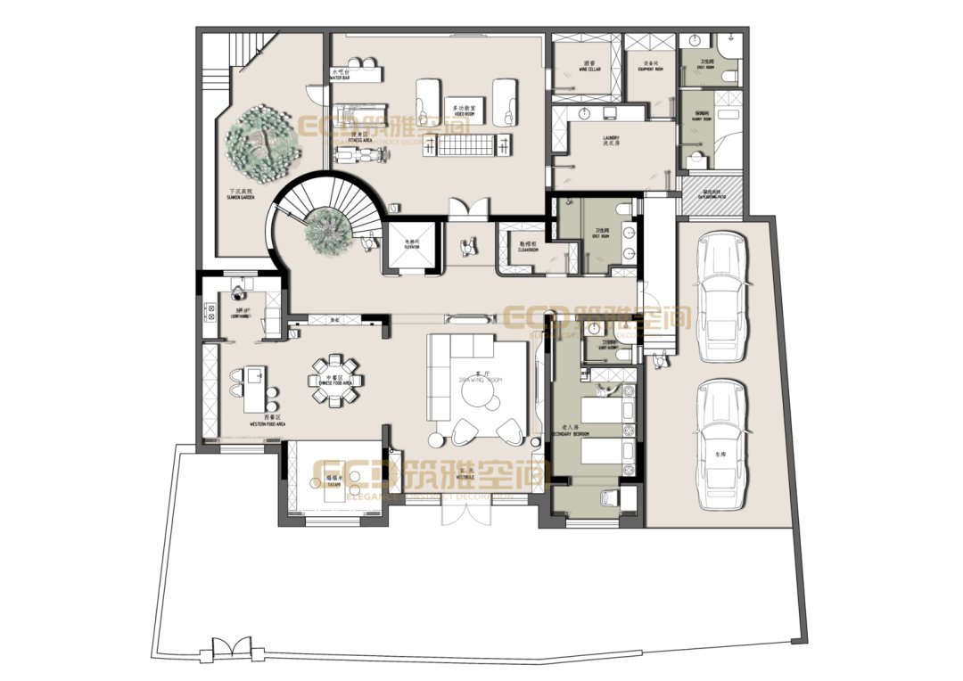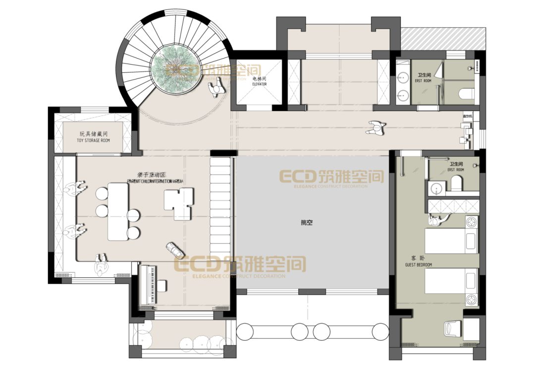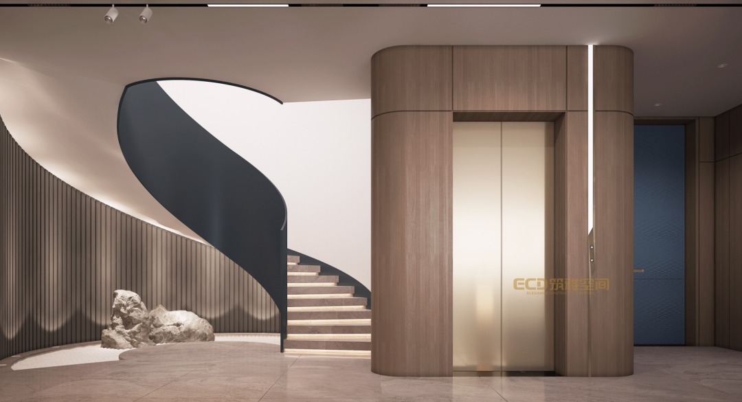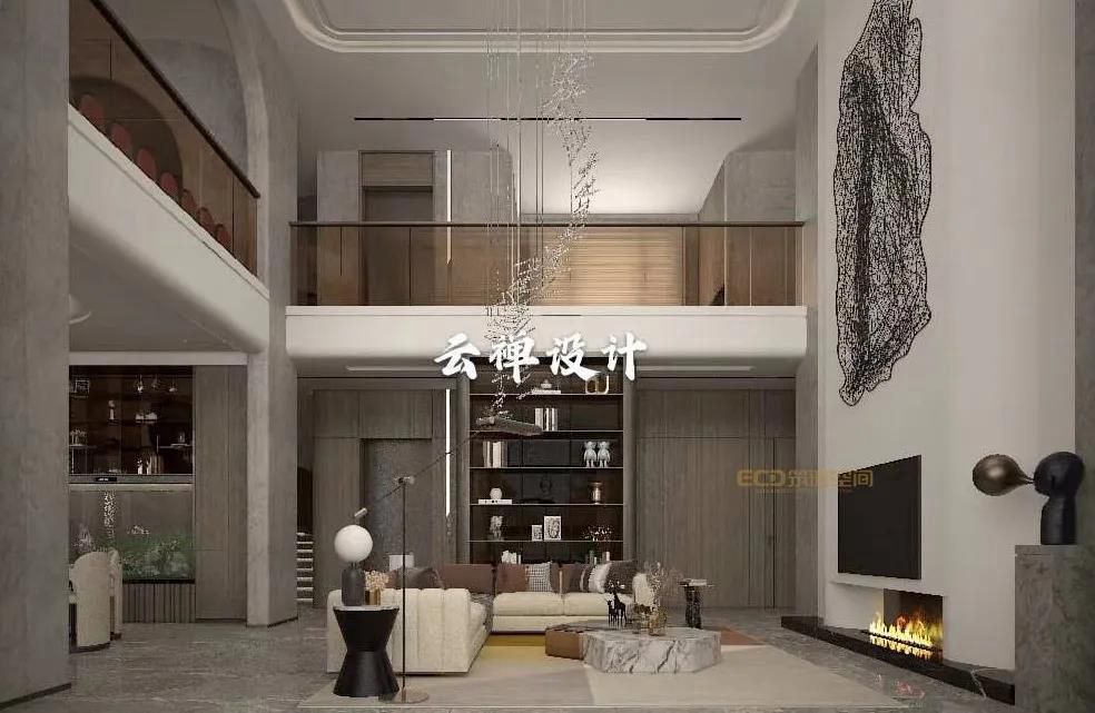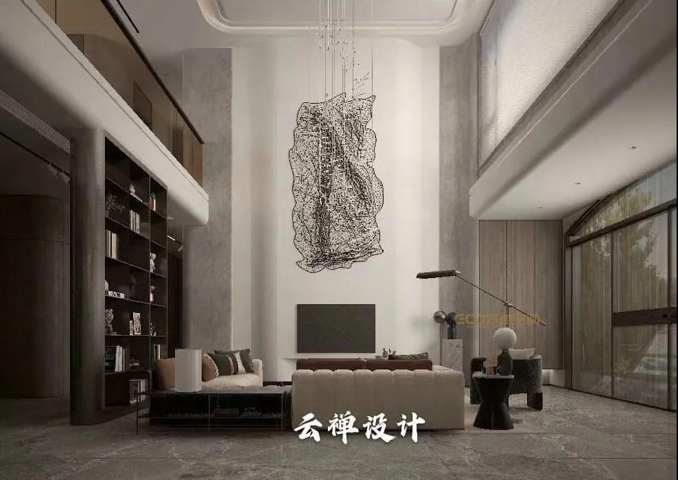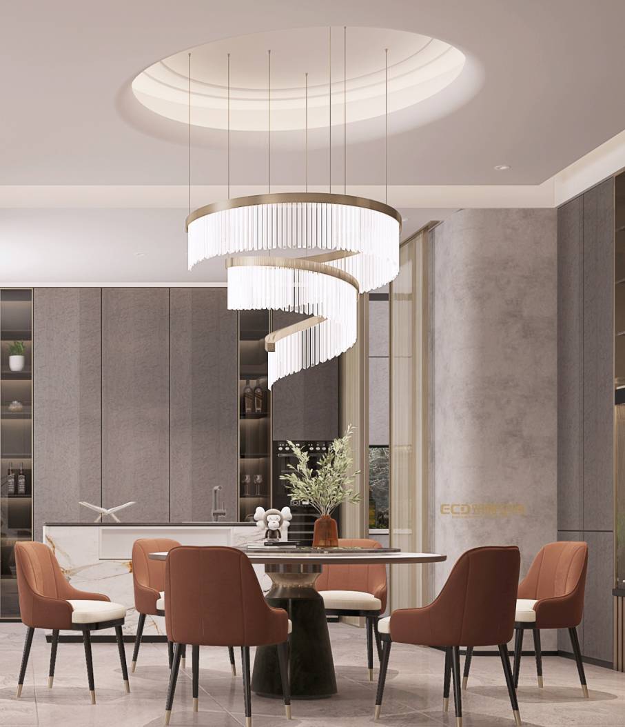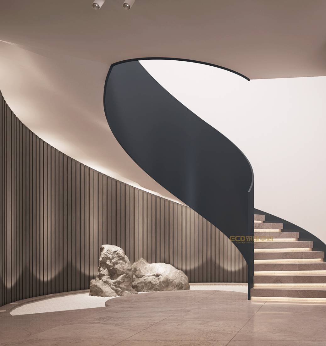 挑高的客廳搭配旋轉(zhuǎn)樓梯,輕奢、高級(jí)在這里展露無疑。