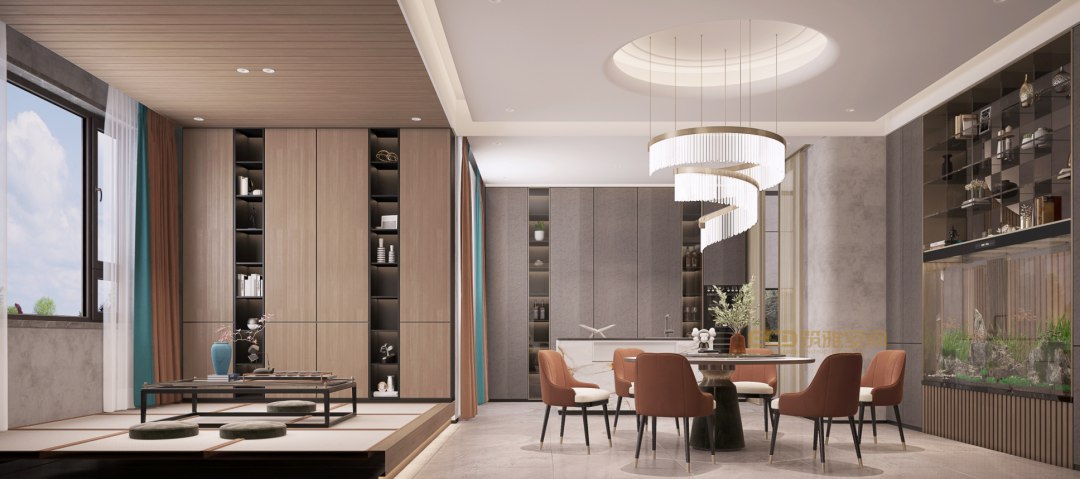 餐廳、茶室連成一個(gè)整體,利用天花板的造型進(jìn)行分區(qū),使得整理空間簡單大氣。