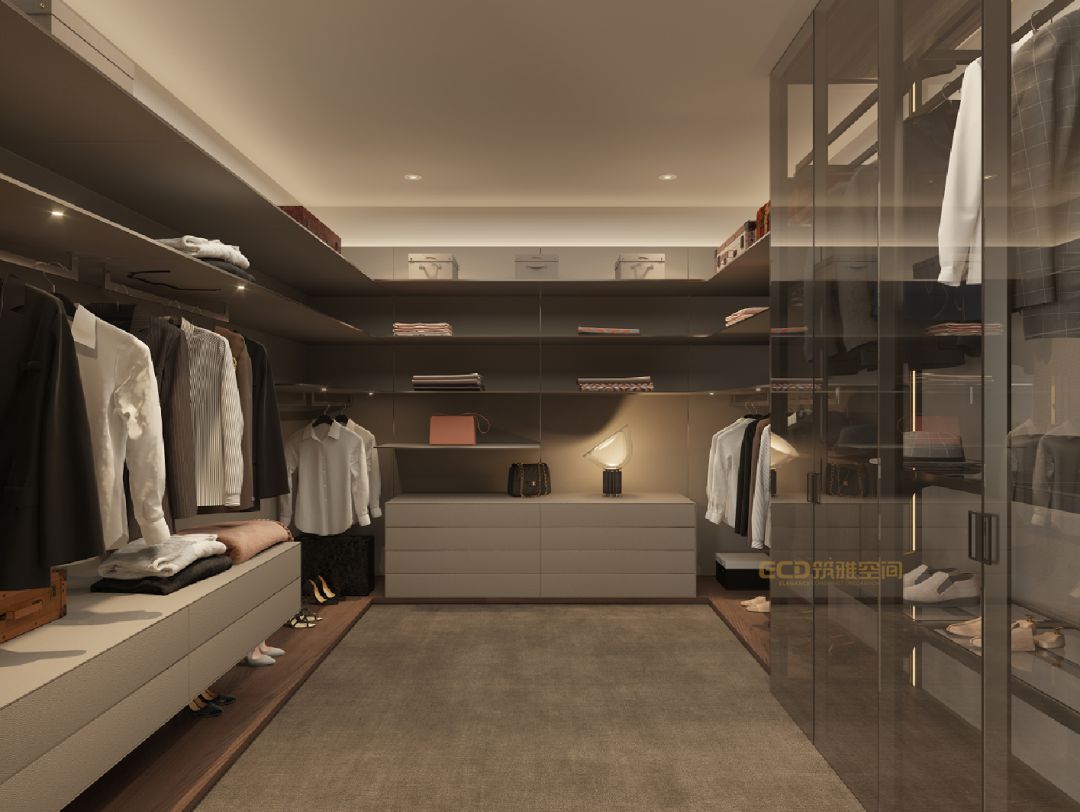 臥室的設(shè)計(jì)優(yōu)雅獨(dú)特、簡潔明快;衣帽間的設(shè)計(jì)很有特點(diǎn),用玻璃當(dāng)柜面,時(shí)尚度MAX。