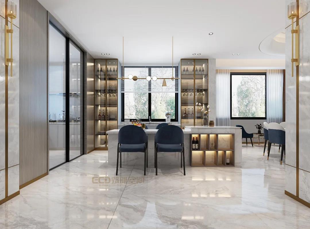 餐廳的通透性、采光極好,家居的選用也備顯質(zhì)感、高級、低調(diào)而奢華。中餐廳與西餐廳空間連成一道簡潔的線條,島臺與西餐餐桌相連,整潔、實用無雜亂,令人舒心與舒適。