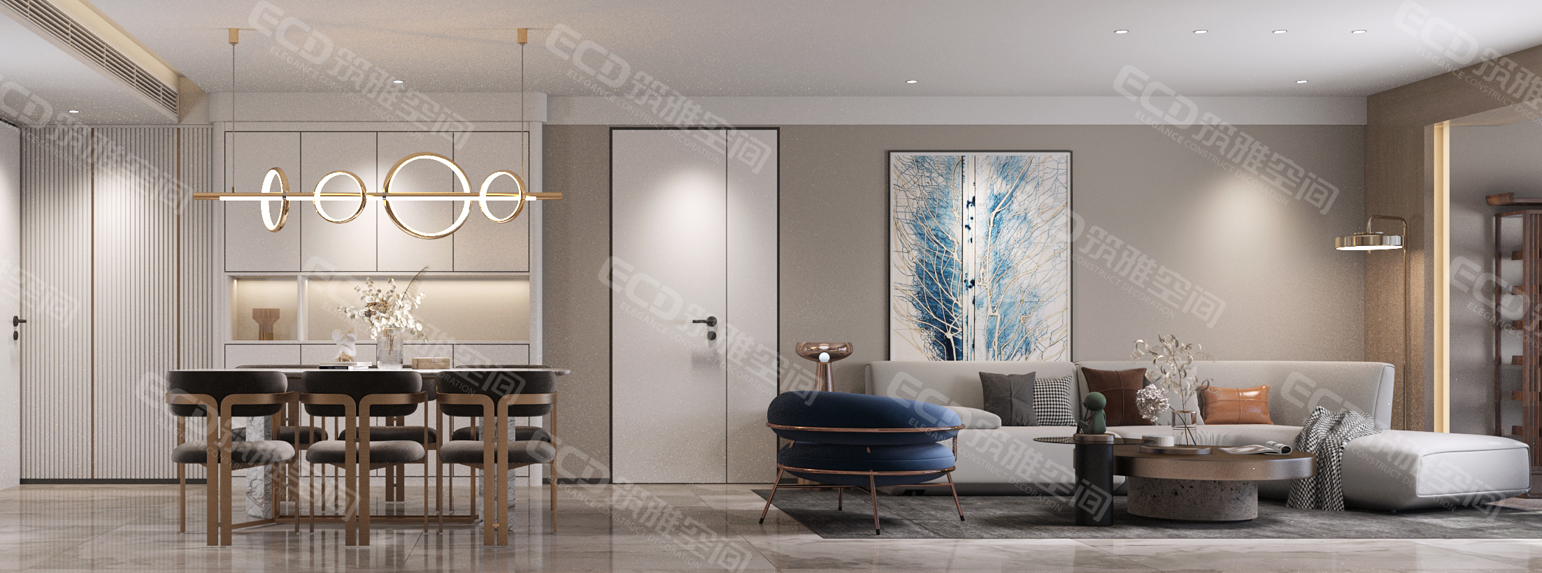一進(jìn)門,一眼便將客廳,餐廳盡收眼底,簡約風(fēng)格與輕奢金的搭配無形中為整體空間提升了質(zhì)感與層次,又不顯擁堵。劉老師結(jié)合業(yè)主的需求盡量選用一些細(xì)腳,質(zhì)感的家居,而在配飾方面采用能夠點亮空間和提升空間藍(lán)色椅子和壁畫是的整個空間更有質(zhì)感,讓空間具有呼吸感。