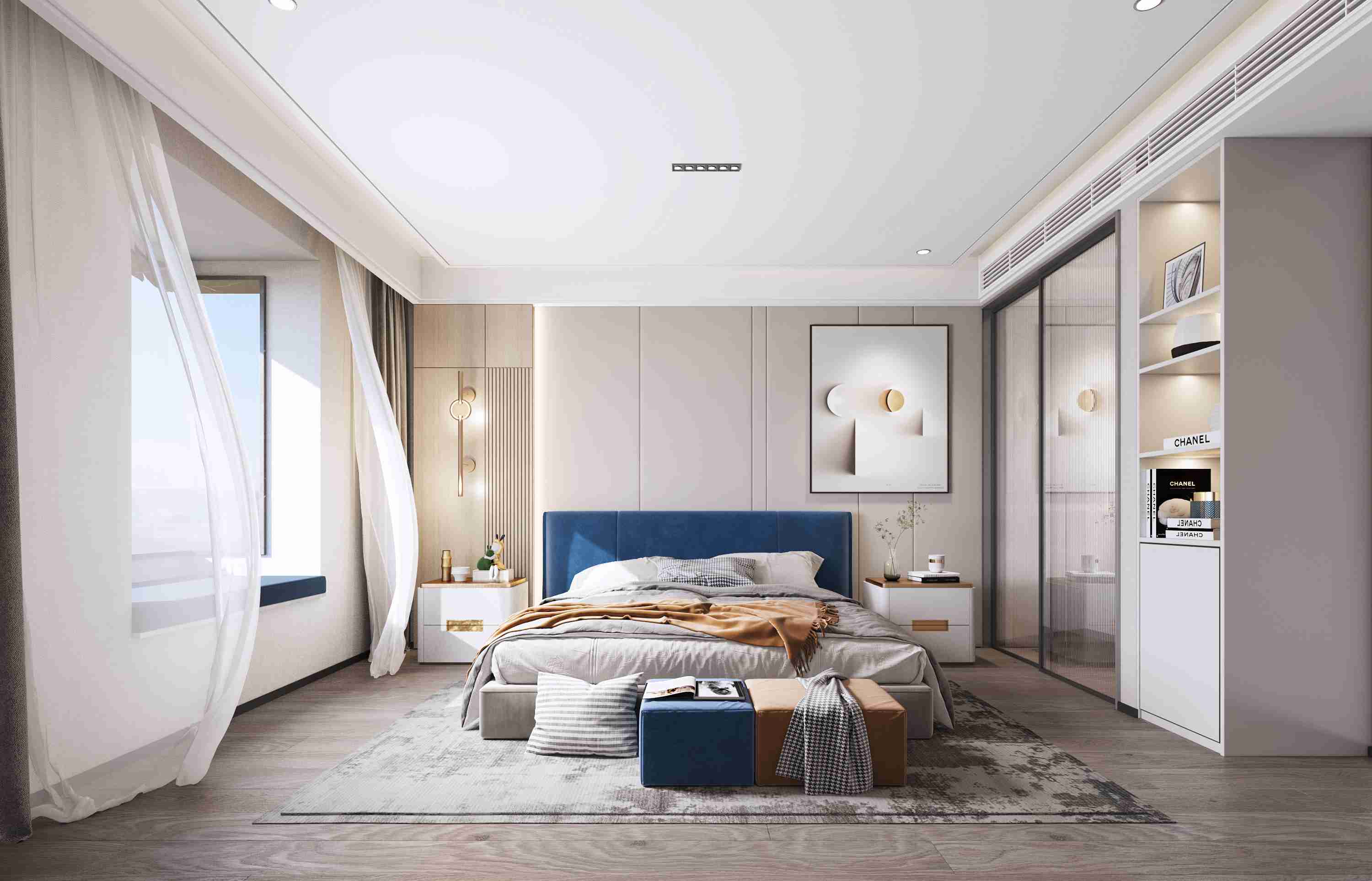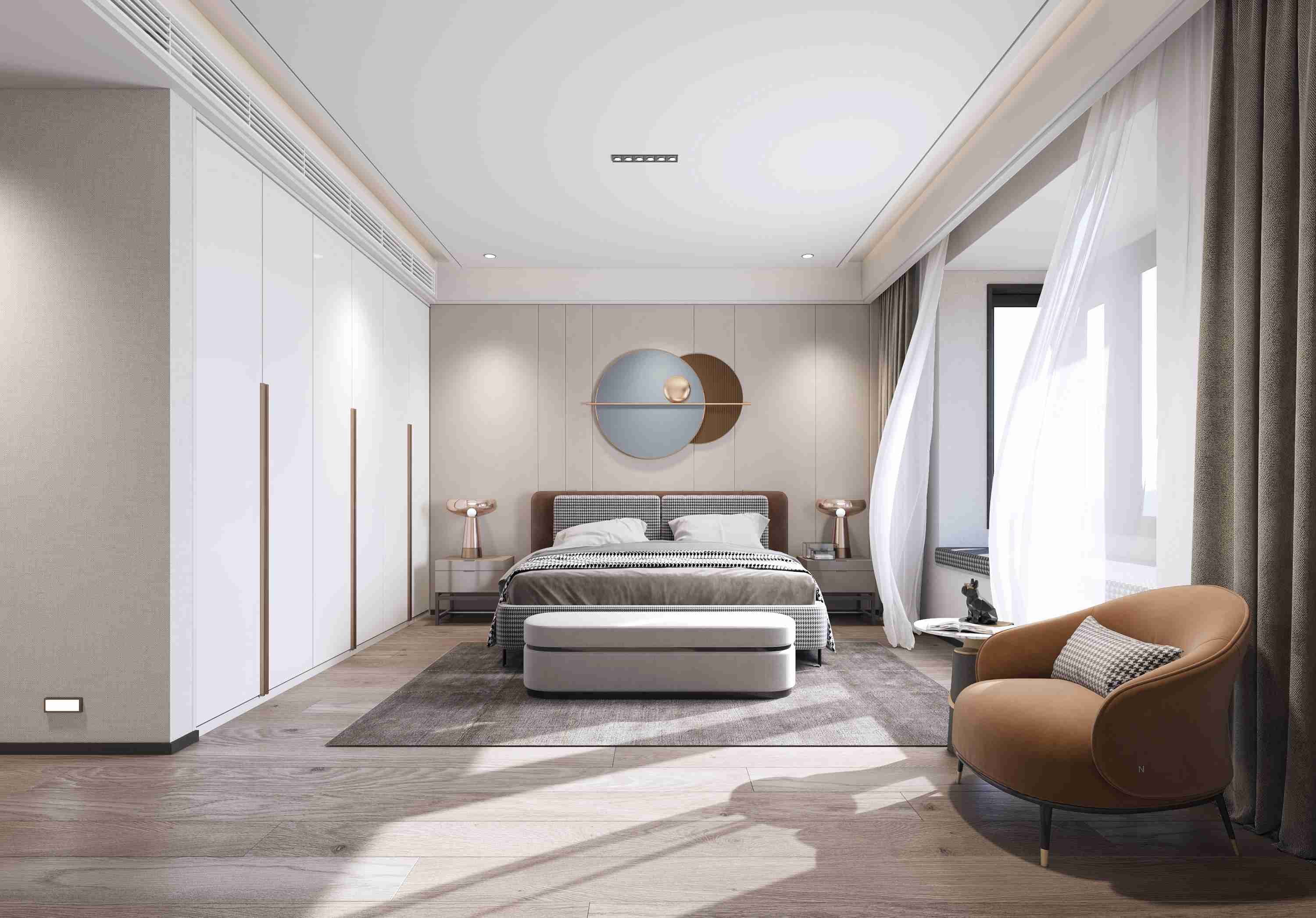 主臥背景墻選用暖灰色的皮革硬包,不規(guī)則的線條打造出休閑隨意的感覺有避免了整體木板的單調(diào),搭配寥寥裝飾,渲染出質(zhì)感,高級的私人空間。