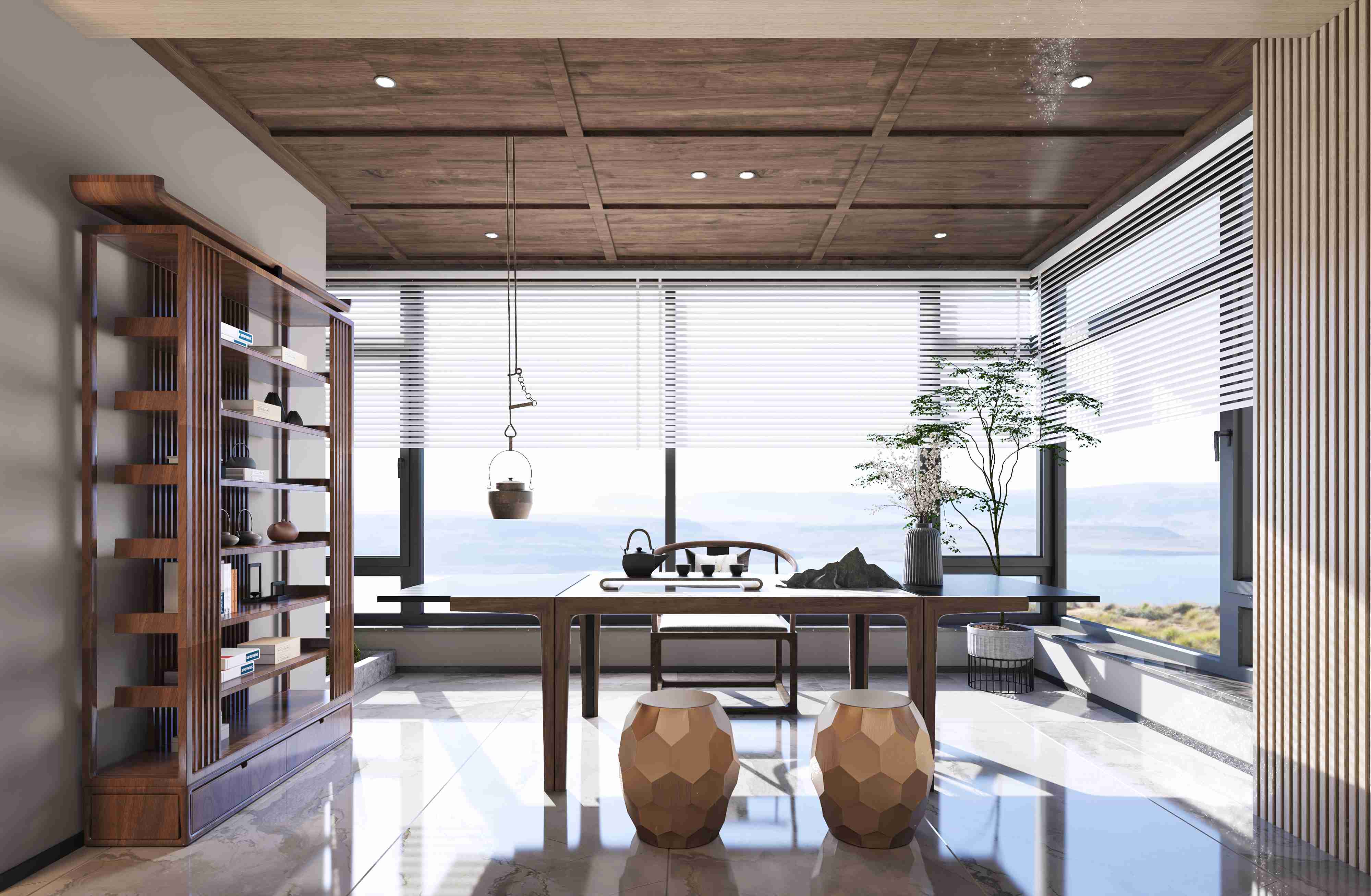 桌上的飾品給人內(nèi)斂豁達(dá)的能量,置身于此處品茗思考,想必可以獲得新的靈感發(fā)現(xiàn)更多可能。通過木飾的桌面搭配中式的主椅和圓墩設(shè)計讓品茶聊天的友人之間有了一種凝聚的氛圍,看海天一色不用過多言語,就已經(jīng)和美好。