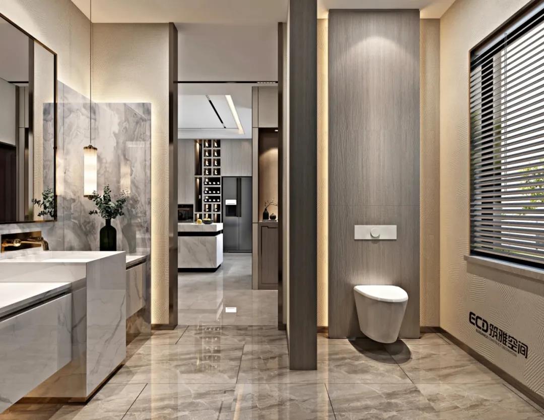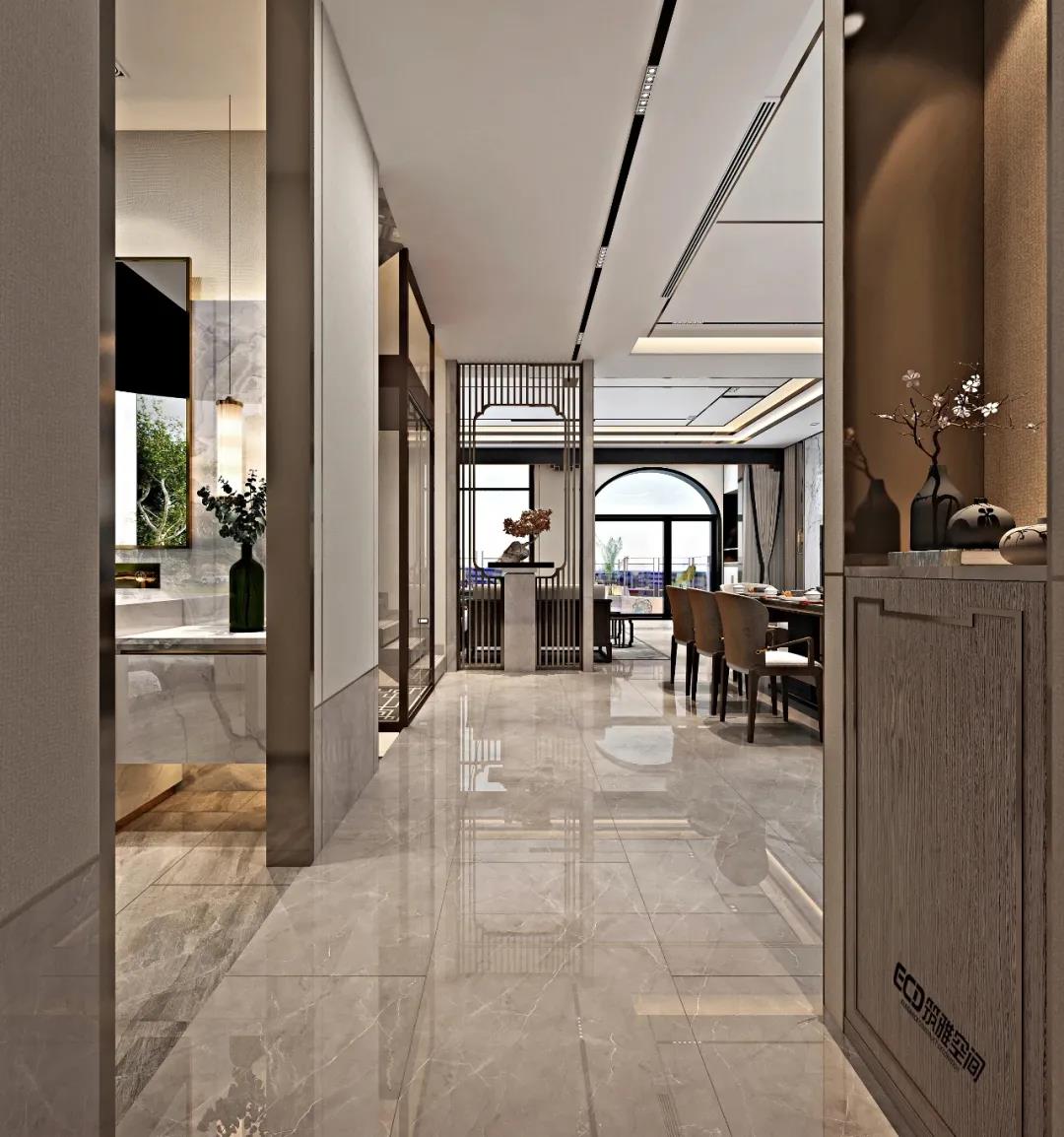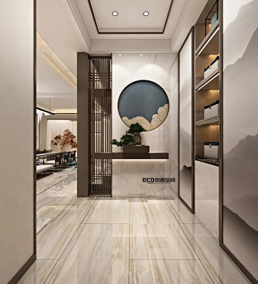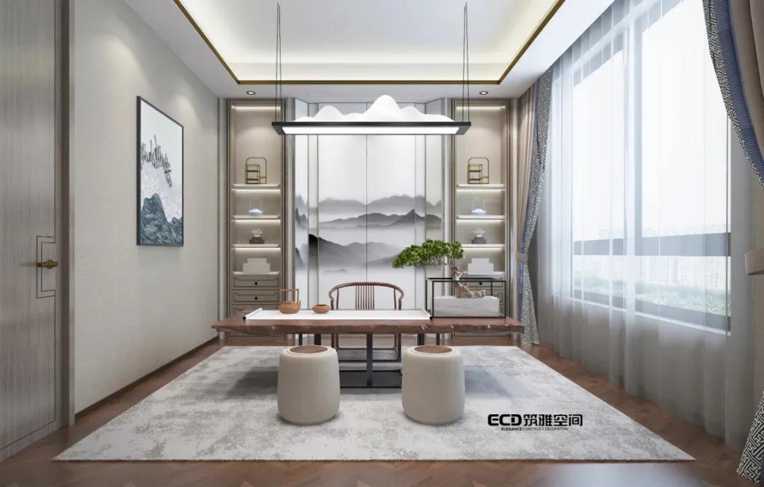 無處不山水,無處不中國,無處不現(xiàn)代。山、水一直以來都是中式設(shè)計主要元素,在本案中,山水仍然是貫穿整個空間設(shè)計的靈魂,我們筑雅空間的威海裝修設(shè)計師以不同方式將山水元素符號進(jìn)行演變,通過設(shè)計來傳達(dá)現(xiàn)代中式雅致、靜謐空間氛圍。比如門廳的山景裝飾,活動室的潑墨山水畫、書房的山水畫背景等,不同空間以不同形式來突出元素,內(nèi)化自然山水之靈,借當(dāng)代設(shè)計的手法,營造舒緩自然、平和雅致的現(xiàn)代品質(zhì)生活儀式感。