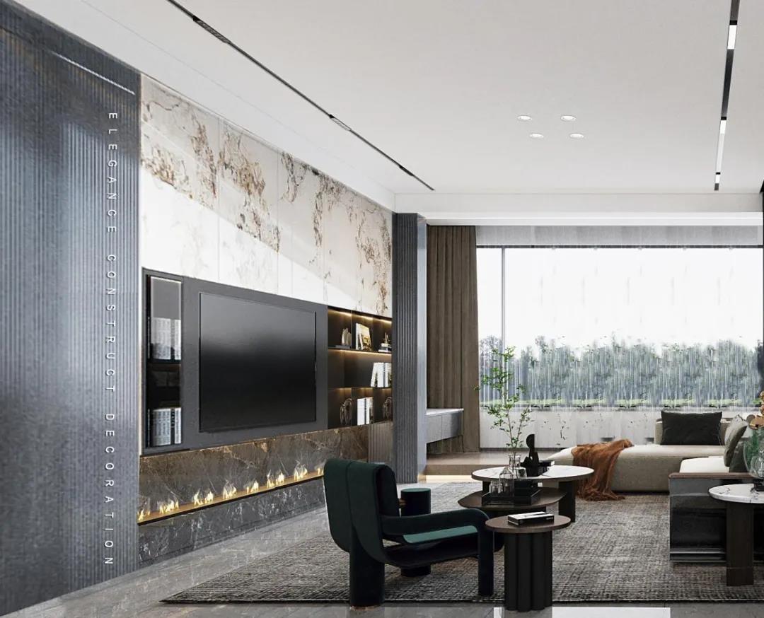 電視墻面與柜體一體化設計,帶來不一樣的視覺張力??蛷d與陽臺連通,空間得以延伸;大面積窗戶的優(yōu)勢,極大限度地加強室內(nèi)空間的光線流動。