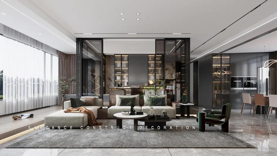 在設計時,王老師根據(jù)各個區(qū)間的可能性,對空間動線進行重新規(guī)劃,追求一種居住舒適度與生活藝術的合理表達。公共區(qū)域圍繞玄關-餐廳-廚房-客廳-書房進行展開,采用開放式的設計布局,增強空間的流動性,打造出讓人一目了然的流動空間。