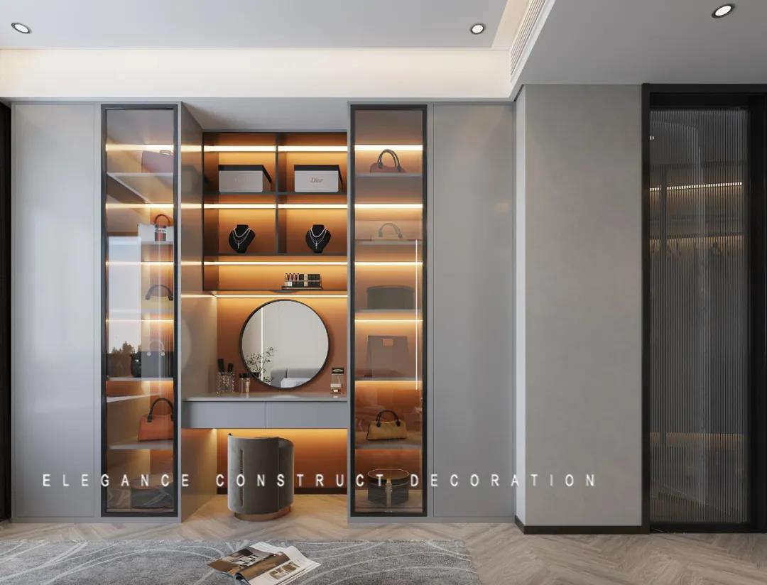 在靠墻的一側(cè),為女主人貼心設立了專屬的小空間,將心愛的包包與飾品擺設在這里,為自己畫一個美美的妝,感受每一個瞬間滿滿的幸福。