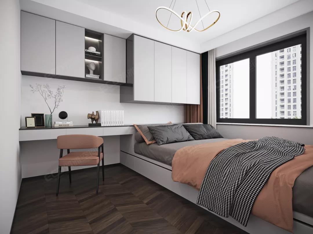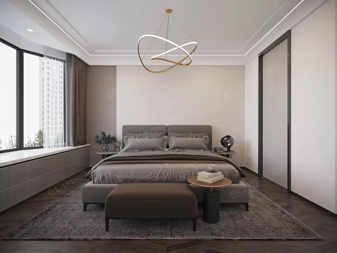 臥室靜謐的色調(diào)搭配干練的線條,摒棄傳統(tǒng)繁雜風(fēng)格,背景畫(huà)與金屬燈飾的巧妙混搭,給人簡(jiǎn)約時(shí)尚且不失溫馨舒適的感覺(jué),豐富整個(gè)空間的層次感。