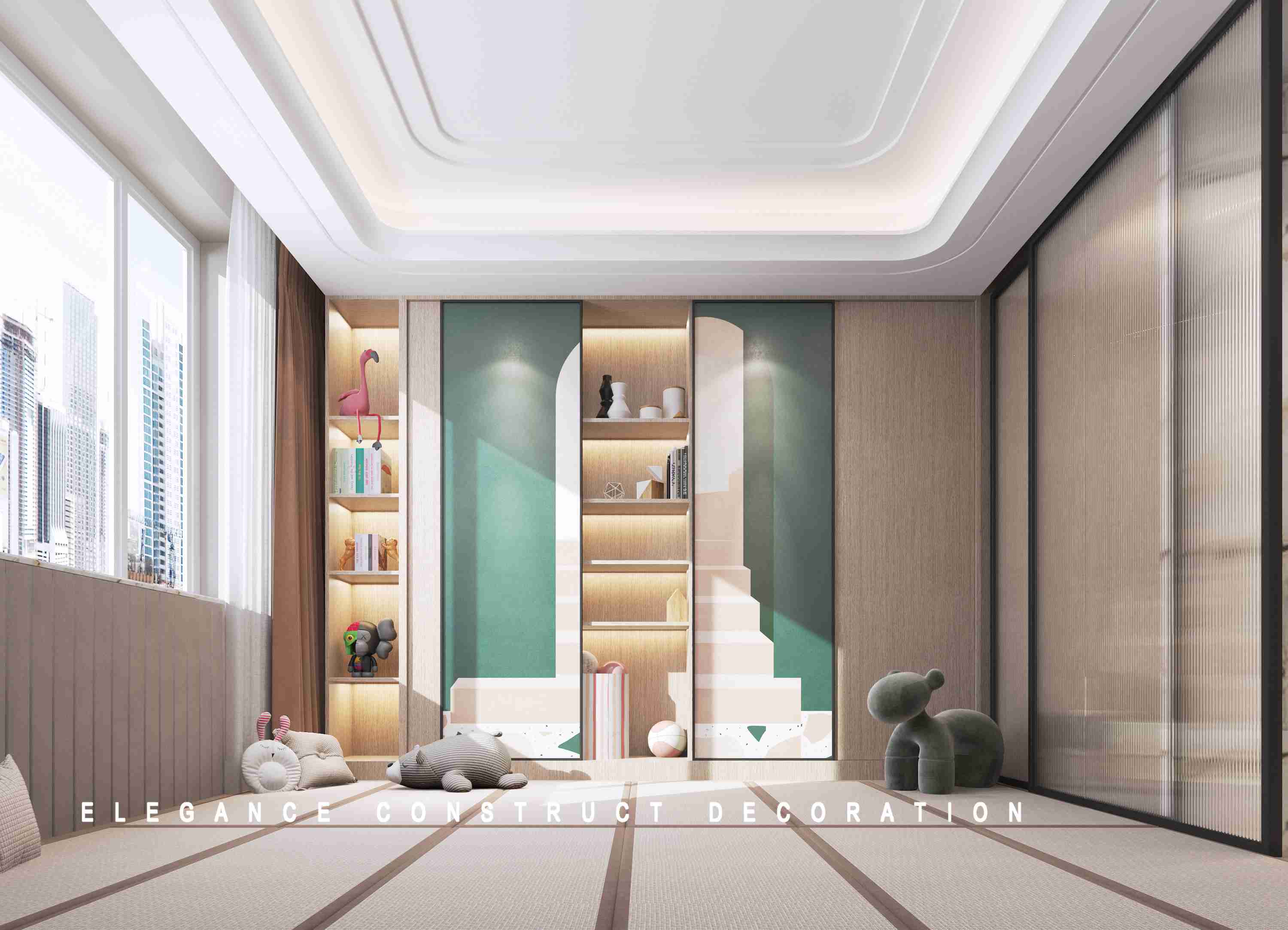 舒適的配色,可開合的推拉門畫與玩偶飾品共同演繹出空間趣味,童趣的氛圍給一對女兒的成長增添更多色彩在玩樂中,遇見童趣,幸福成長。劉老師以層次化的吊頂設為空間增添亮點,將心愛的手工或是收藏品放置于此,每次打開城堡的大門,都是一次與心中寶藏的邂逅,收獲一天的快樂
