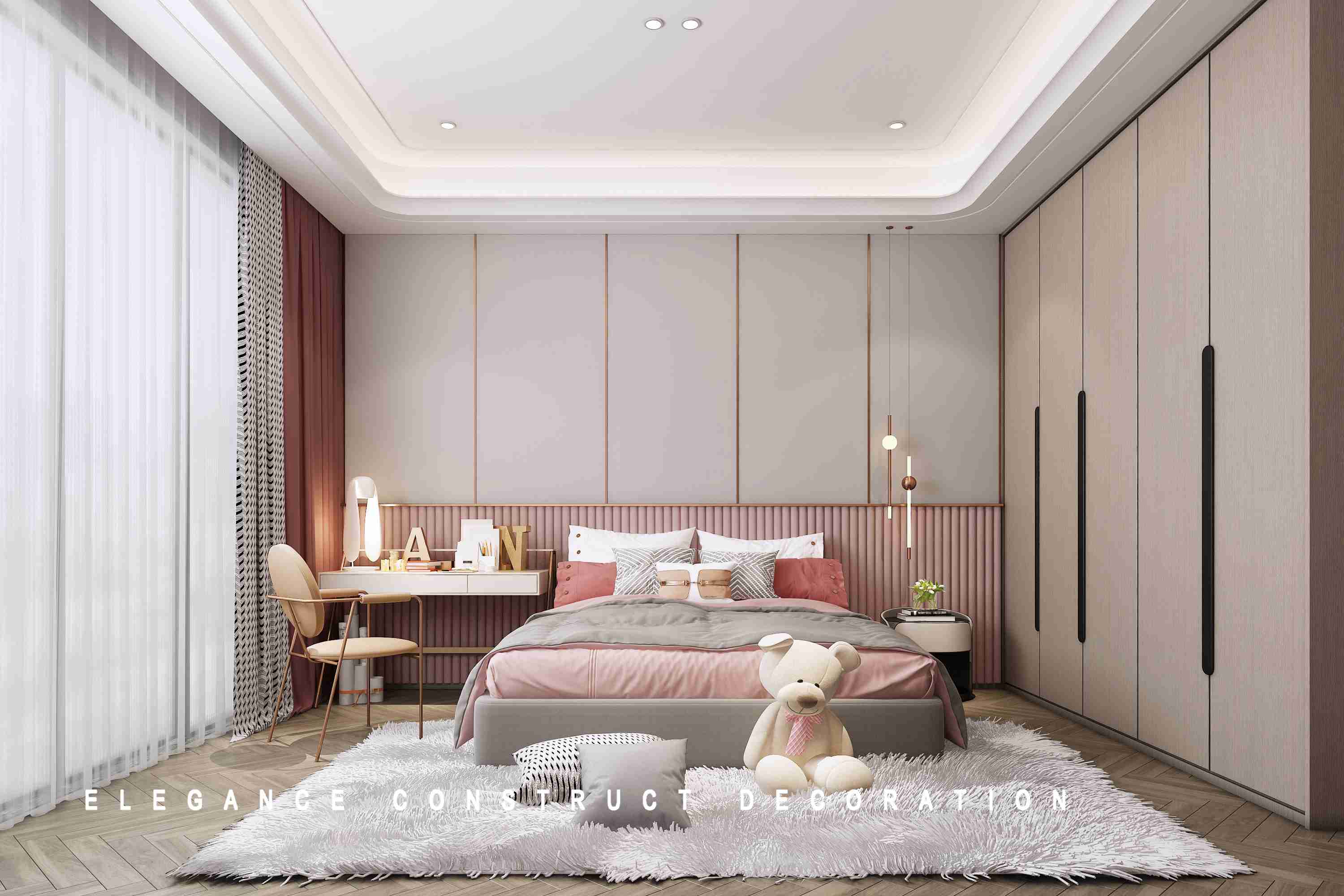 與大女兒房的夢幻粉不同,小女兒房采用了暗粉色與灰藍色為主色調(diào),展現(xiàn)了小女兒的性格,不過即使是這樣低飽和度的主調(diào)中,也隱藏著小女兒童真的另一面,絲毫不顯得違和、浮夸。