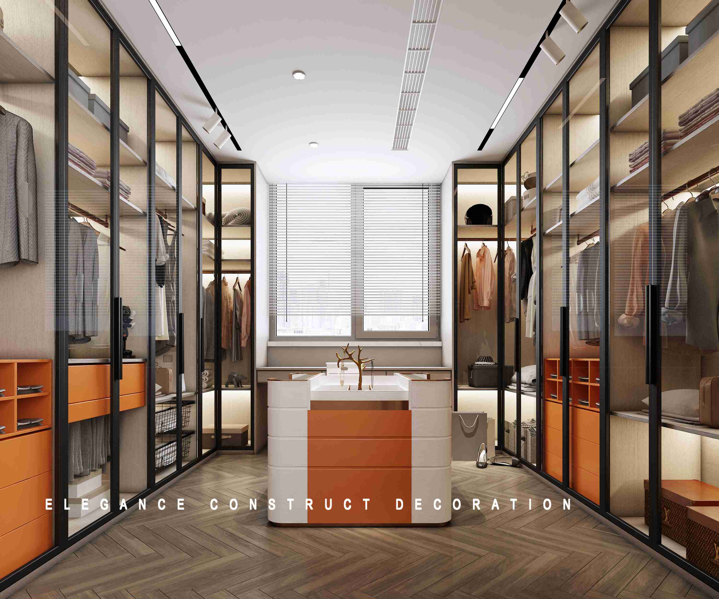 愛美之心人皆有之,精致的衣帽間讓愛美之心變得一發(fā)不可收拾。清新活力的愛馬仕橙,搭配大面積使用的玻璃柜門猶如落地窗的效果。玻璃和黑色邊框的配合及無主燈設計,為空間增添更多質(zhì)感,精致飾品擺放裝飾,簡約視覺元素的勾勒,在空間中能創(chuàng)造驚艷且深刻的美學表達。