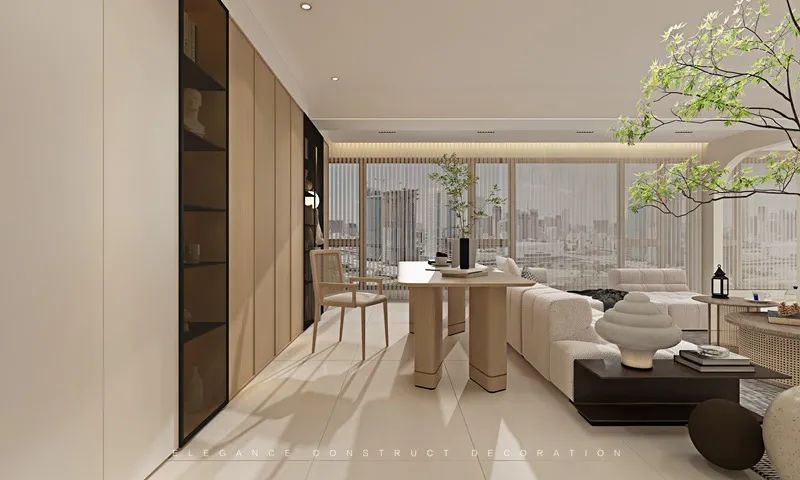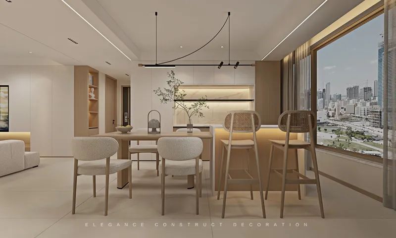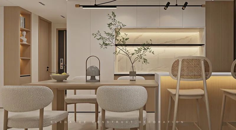 餐廳高柜的運(yùn)用使得整體達(dá)到整體貫連一致色系的簡(jiǎn)約感。