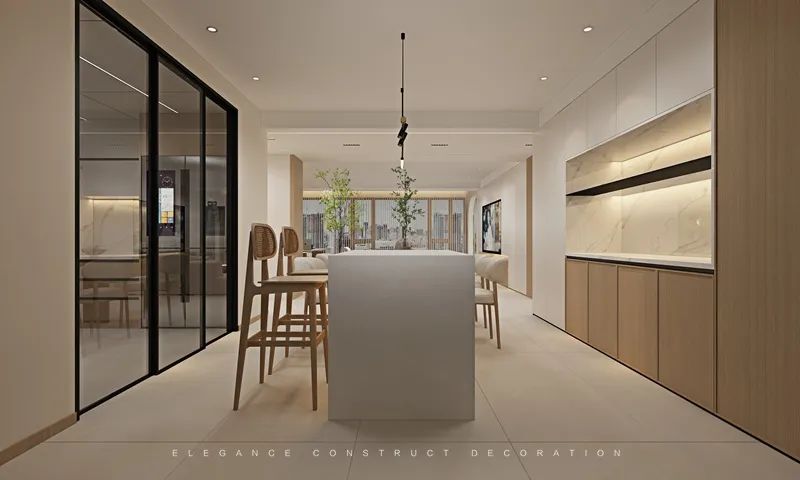 中西餐廚與吧臺(tái)整體動(dòng)線分明,看似簡(jiǎn)單,其實(shí)是綜合屋主當(dāng)下生活需求最好的布置方式,大大增加了餐廳空間的視覺感。