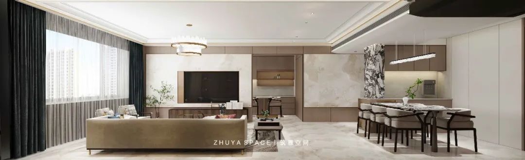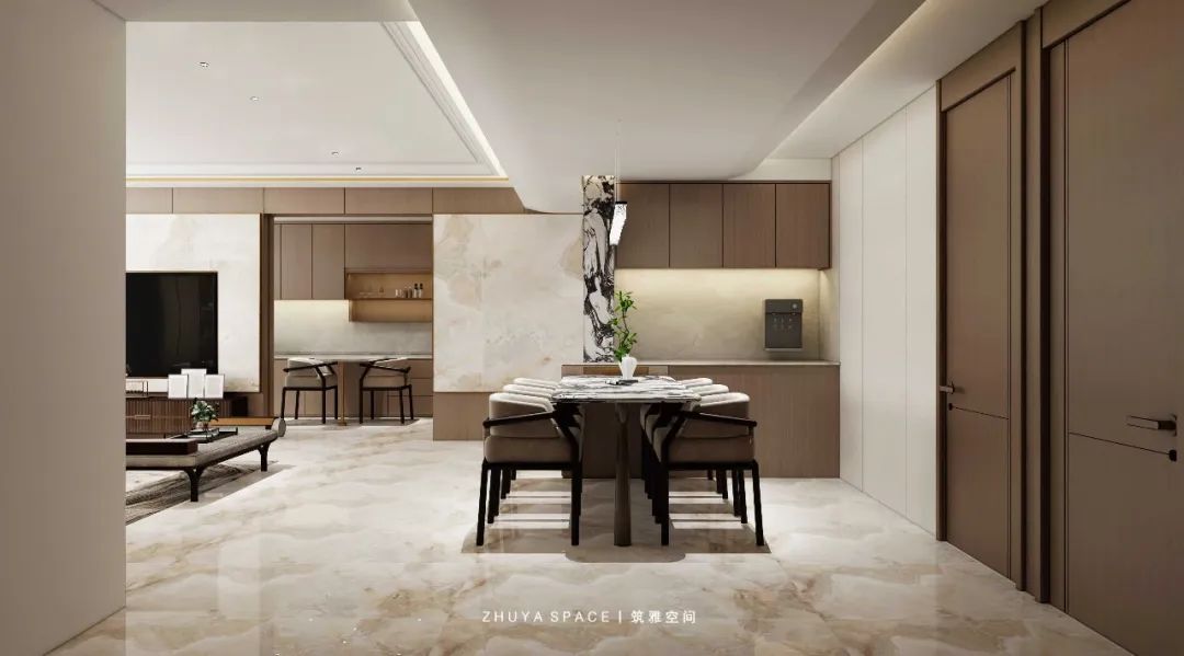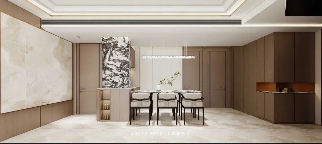 餐廳部分采用經(jīng)典木色與理石搭配帶來(lái)更豐富的視覺(jué)層次,整體線條簡(jiǎn)潔、結(jié)構(gòu)豐富簡(jiǎn)潔美觀的同時(shí)又突顯居者品味不凡的氣質(zhì)
