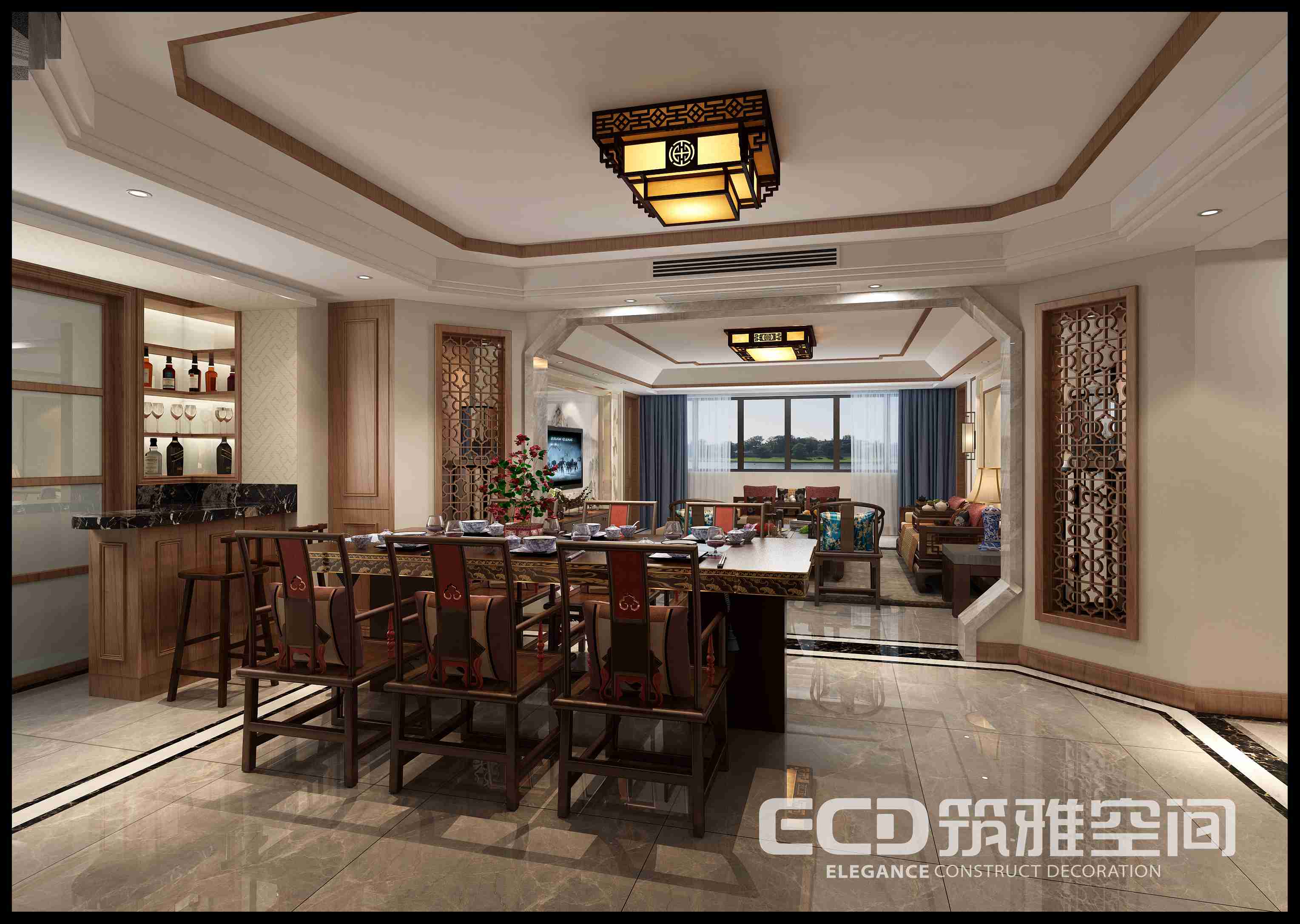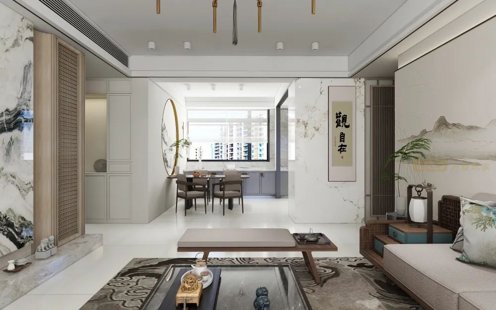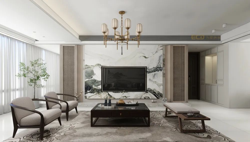 電視背景與客廳背景遙相呼應(yīng)調(diào)動起空間的色彩層次,空間中式元素加入了靈動氣息。