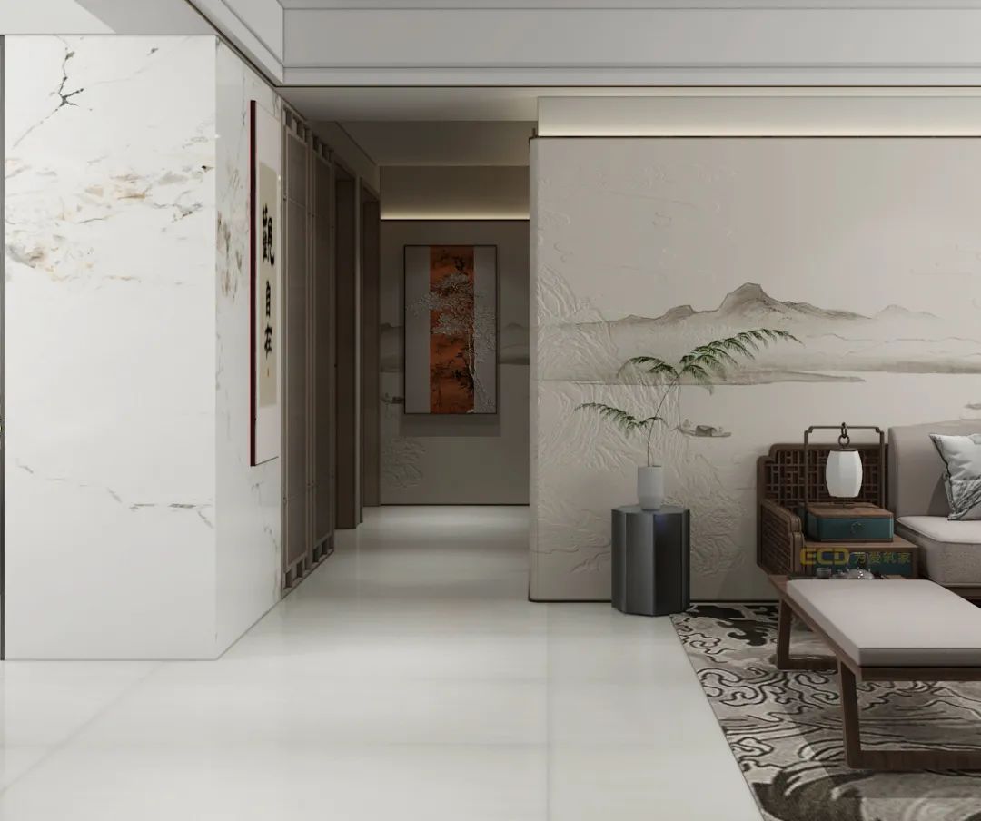 傳統(tǒng)的綠植擺放,與中式精粹青瓷鼓凳,中式元素的空間,使得自入戶起,留給人無限遐想。