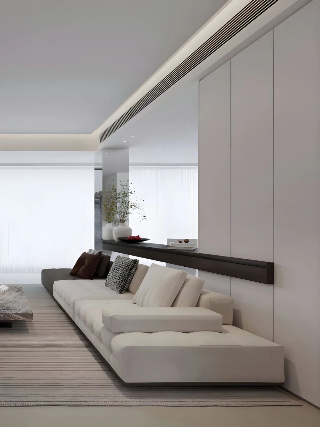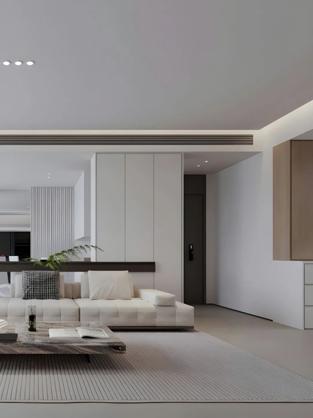 當初決定裝修成極簡風,真的是太明智了!沒有花里胡哨的裝飾,簡單又大氣。客廳的大白墻,配上無主燈設計,