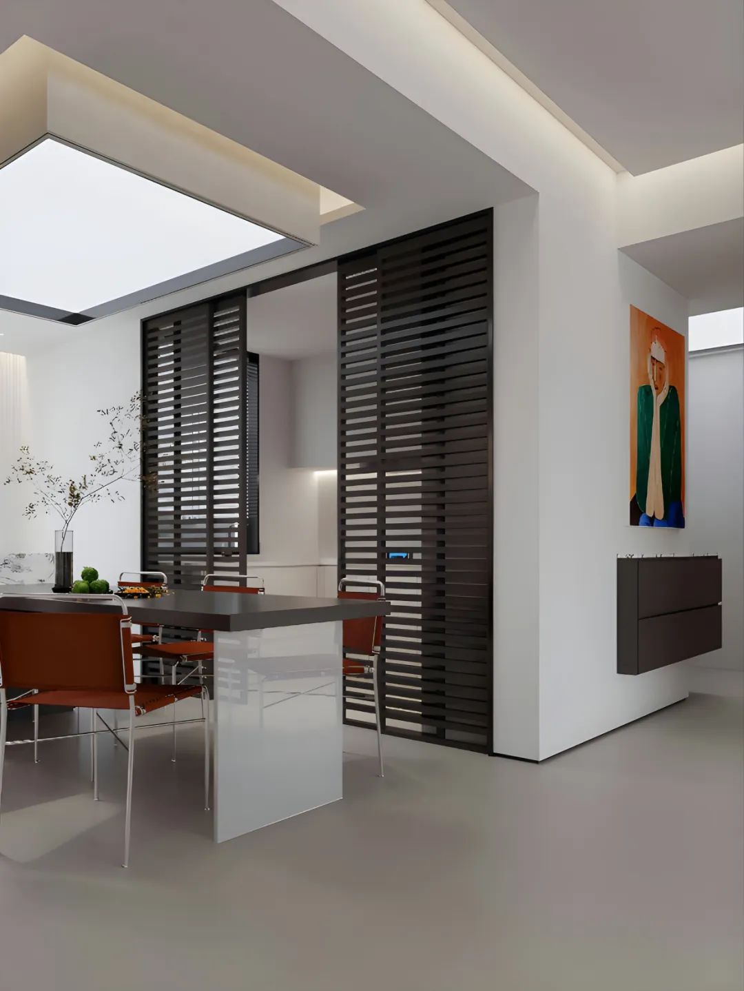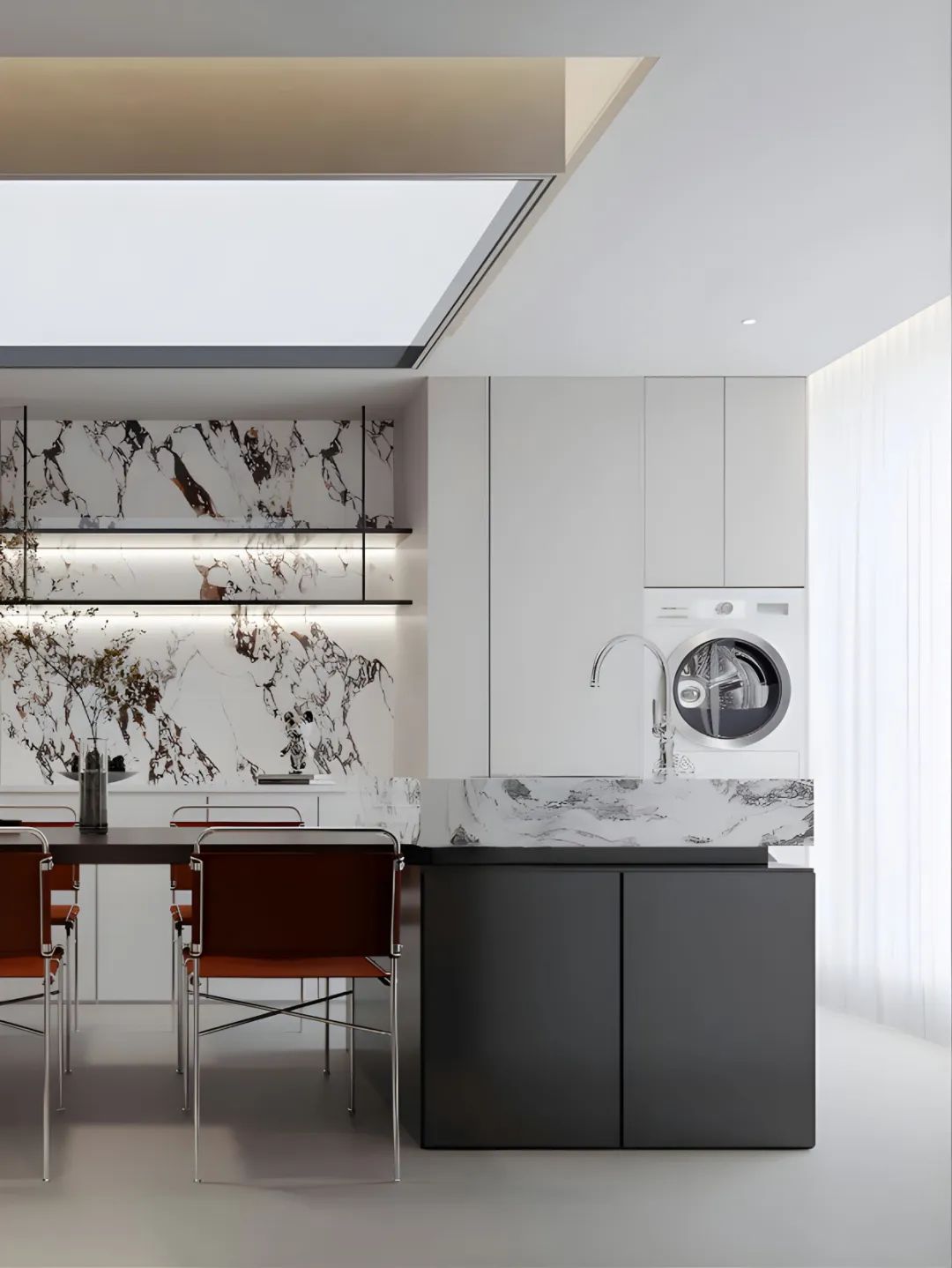 看看這大理石的茶幾,質感拉滿,隨手放本書、一杯咖啡,氛圍感這不就有了。開放式廚房和餐廳連在一起,